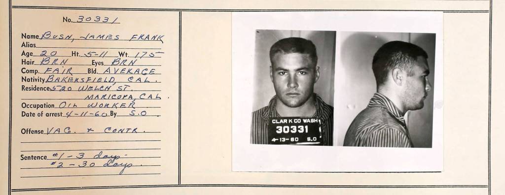 On April 11, 1960, Bush was arrested in Washington on charges of vagrancy and contributing to the delinquency of minors. Two days later, he was placed in the Clark County jail as prisoner #30331. At his processing, he posed for front- and side-view mugshots.