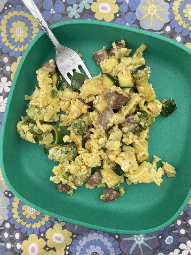 I prepared a gallon zip-close bag each of diced zucchini, kielbasa sausage and broccoli florets. I also packed smaller portions of sweet potato — already roasted and diced — and diced onion.