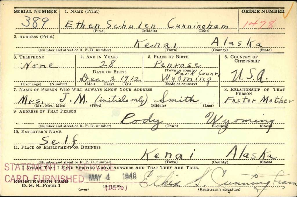 Ethen Schulen Cunningham’s first name had had different spellings over the years. For instance, the headstone on his grave now spells it E-T-H-A-N. So did his niece when she wrote about her uncle in a 1997 letter to the Kenai City Council. But when Cunningham himself signed his draft-registration card in Kenai on Jan. 22, 1941, he clearly wrote E-T-H-E-N.
