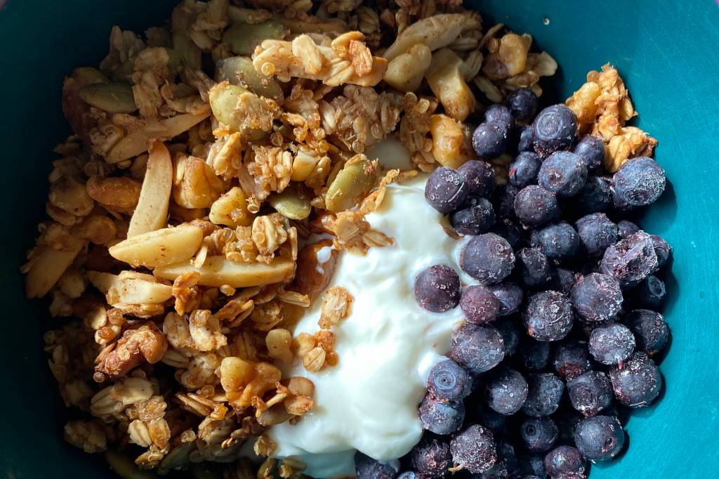 Whisk together the applesauce and maple syrup, then pour over the granola.