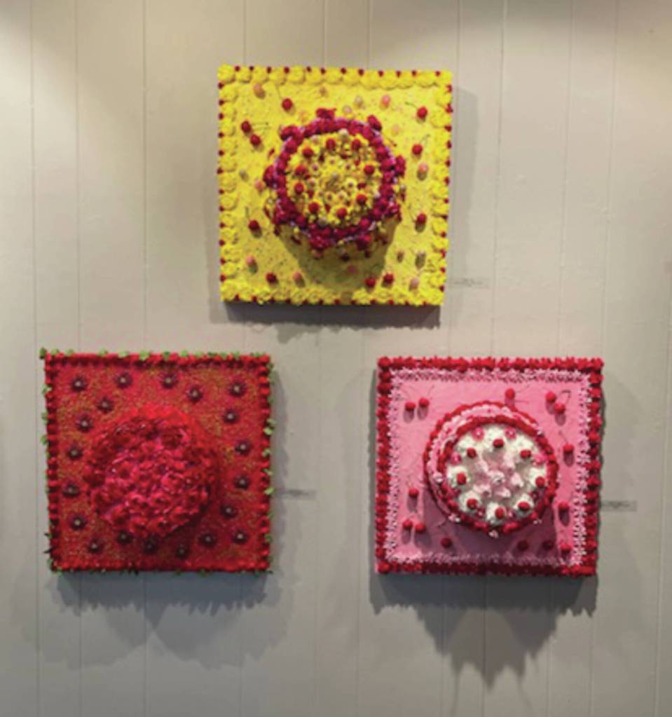 In order to balance the dark component of the show, she added a bright mixed media “decorated cake” section to the show including. The base of the cakes was made with acrylic and plastic foam. They were painted and then decorated in various styles. “To me, the cakes represent the retail component of fast food and all the restaurants that remain.”