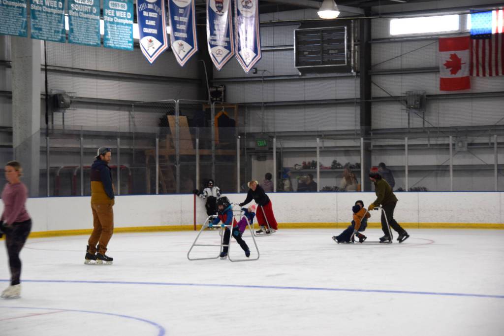 Young and experienced skaters alike enjoy the ice at the Kevin Bell Arena during opening day on Saturday, Oct. 5, 2024, in Homer, Alaska. In addition to a free open skate, the arena also hosted a hockey gear swap and stick time, and a free barbecue lunch for attending community members. Attendees were also encouraged to register for a variety of upcoming skating programs, including youth and adult hockey, figure skating and learn-to-skate classes. (Delcenia Cosman/Homer News)