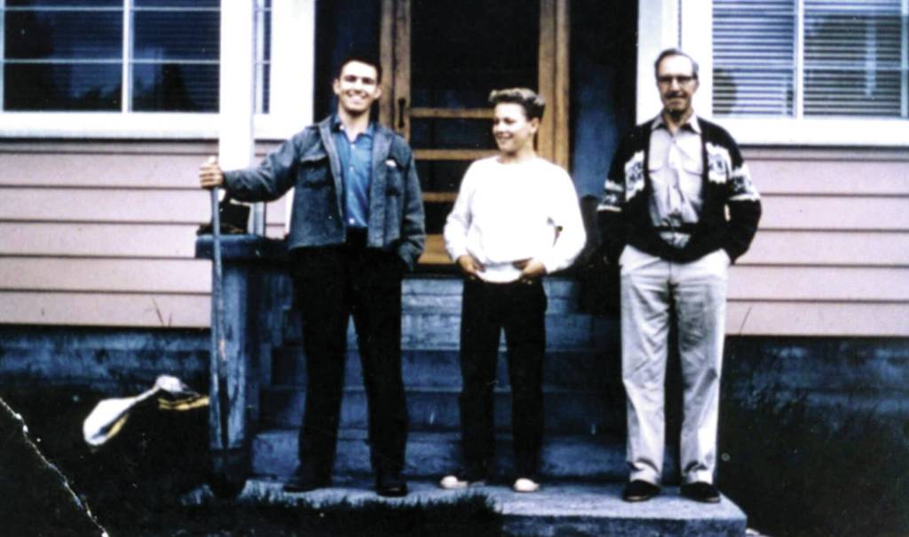 Posing in front of Warren Melville Nutter’s large home in Hope in about 1961 are (L-R): Warren Nutter’s only biological child, David; David’s younger half-brother Frank Gwartney, and Nutter himself. After Nutter died in 1962, his Hope property was split between the two boys.