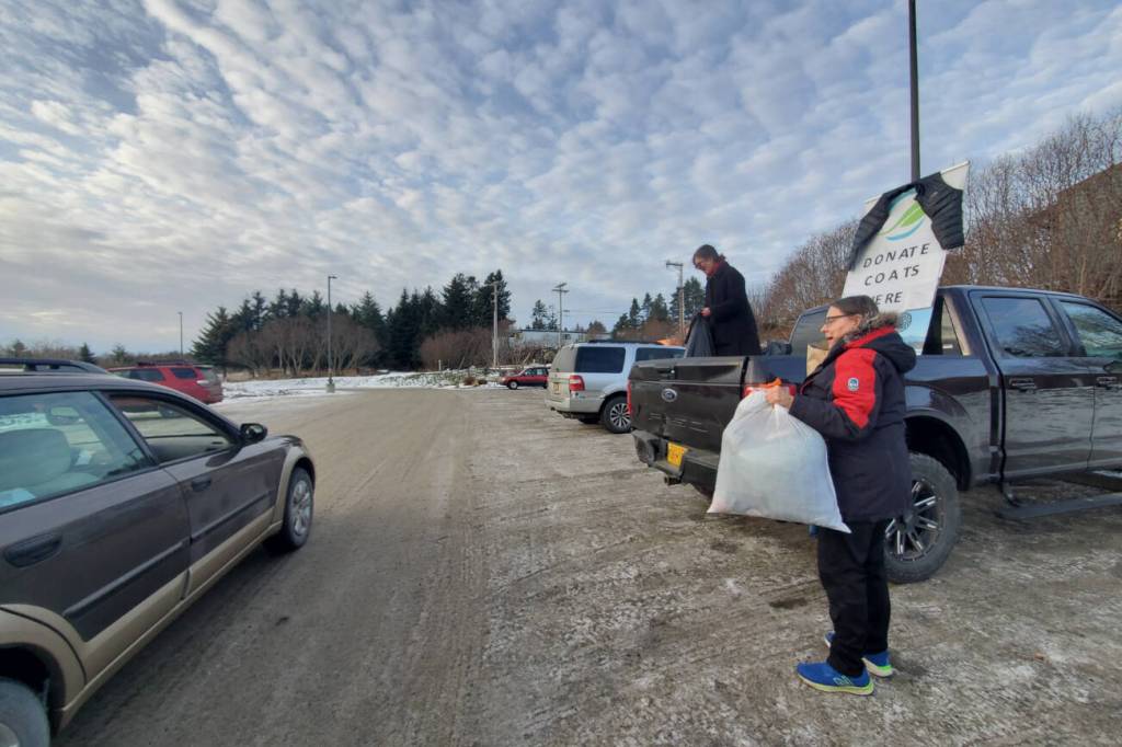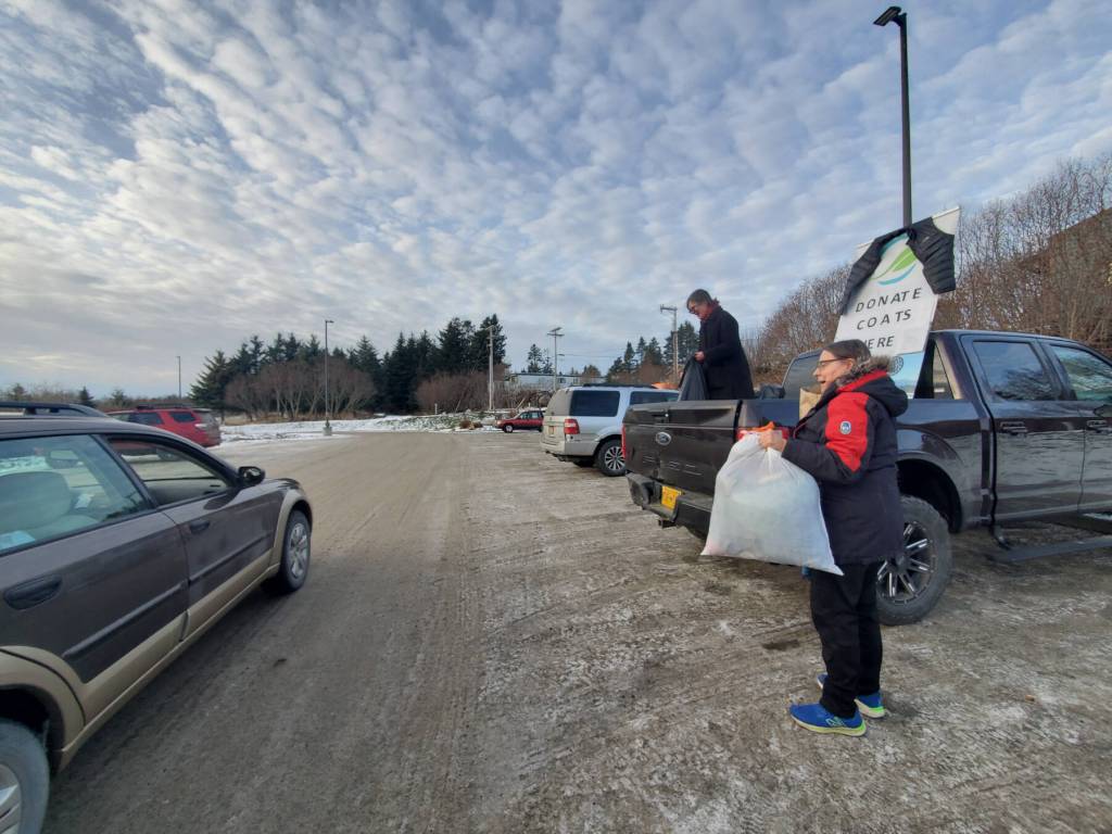 Katie Rich and Joanna Tornes (right) hold a coat drive for Port Graham and Nanwalek in the Homer Public Library parking lot on Saturday, Nov. 23, 2024, in Homer, Alaska. (Delcenia Cosman/Homer News)