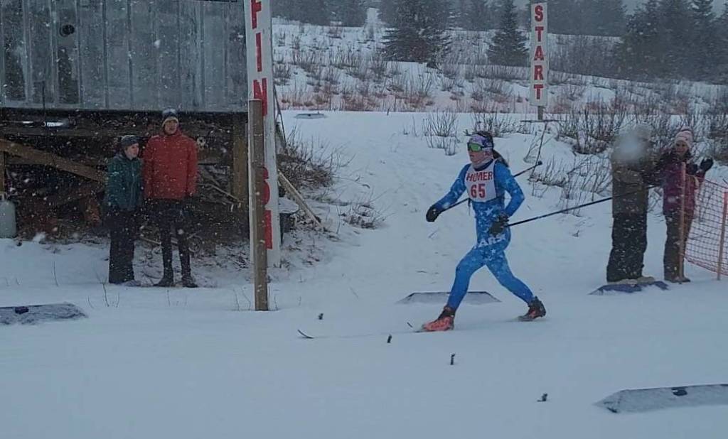 Soldotna’s Ariana Cannava win the girls race at the Homer Skiathlon on Friday, Jan. 3, 2025, at Ohlson Mountain just outside of Homer, Alaska. (Photo provided)