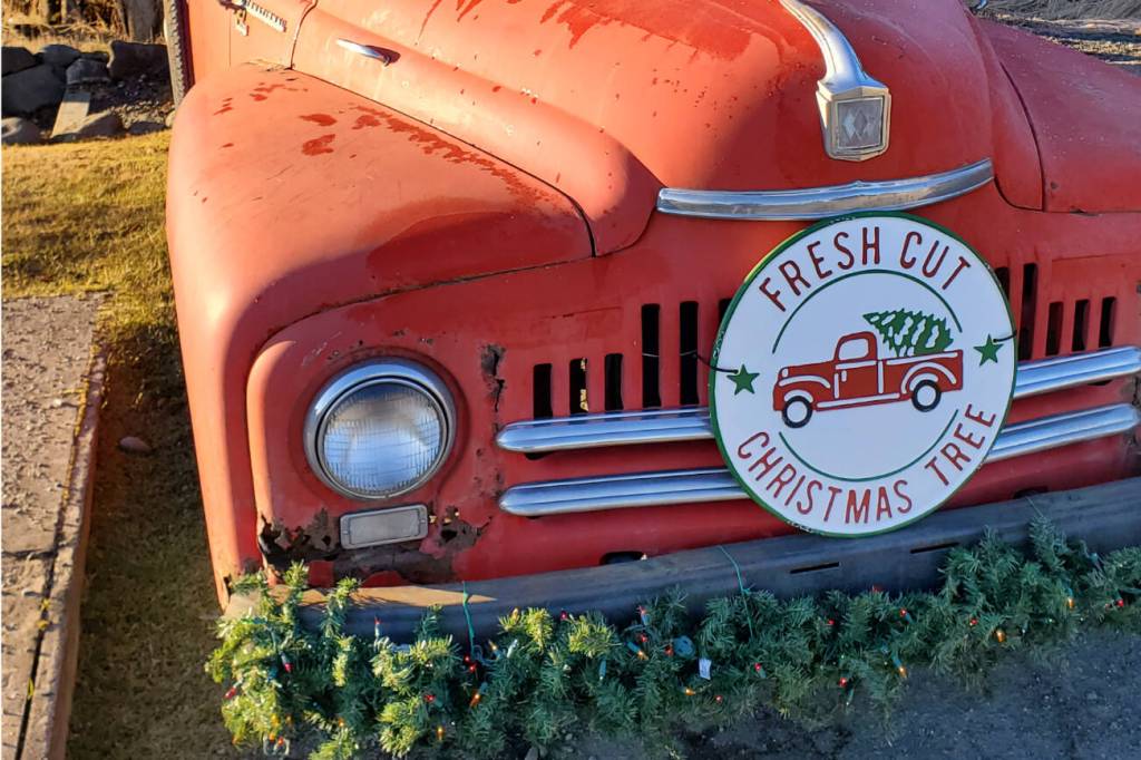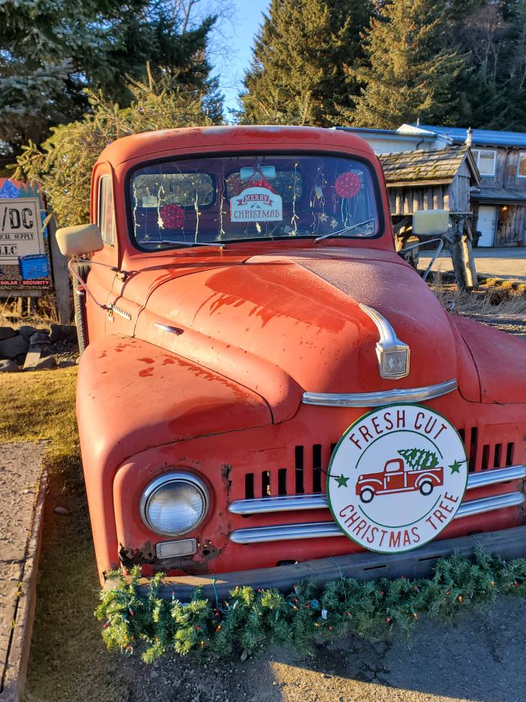 An old truck belonging to Homer’s Jeans advertises fresh-cut Christmas trees on Thursday, Jan. 2, 2025, in Homer, Alaska. (Delcenia Cosman/Homer News)