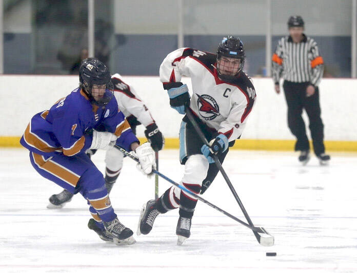 Homer’s Zane Barth tries to poke the puck away from Houston’s Daniel Matveev during an 8-2 loss to the Hawks Friday, Jan. 17, 2024, at the Menard Arena in Wasilla, Alaska. (Bruce Eggleston/matsusports.net)