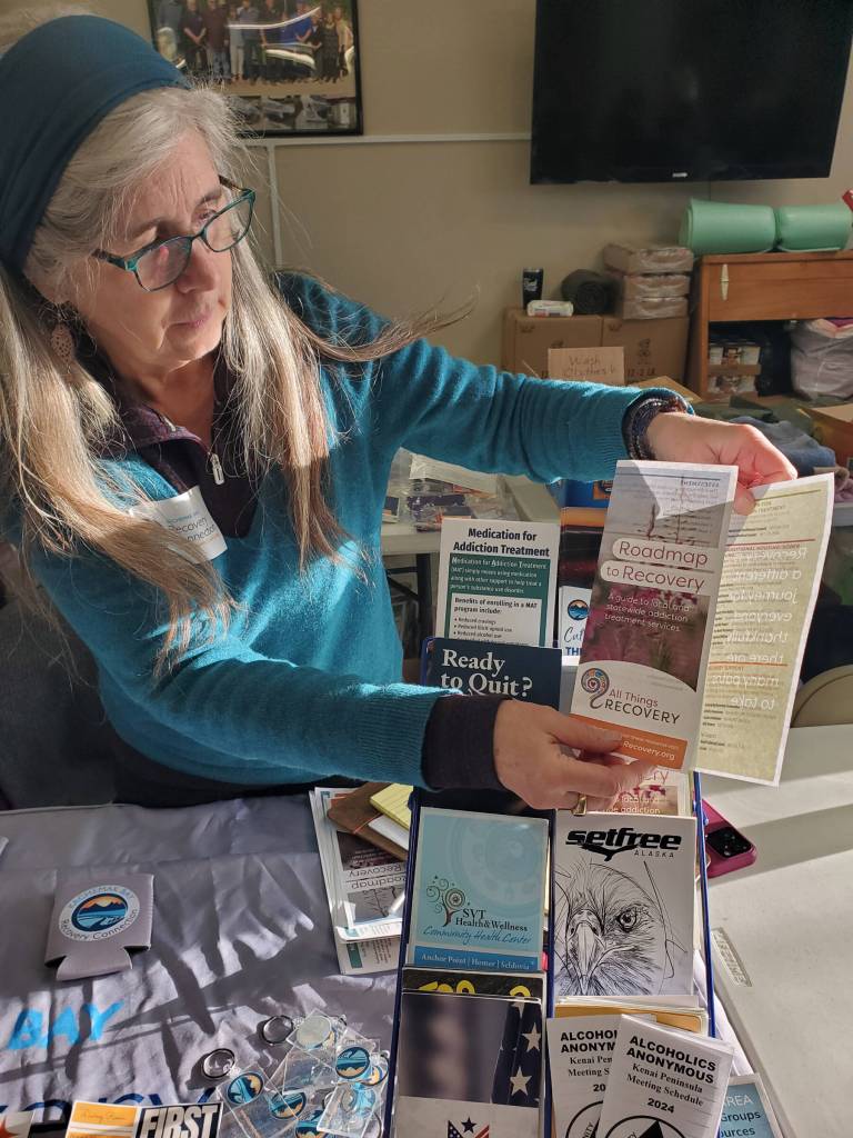 Board Vice President Barbara McNinch manned the table for Kachemak Bay Recovery Connection, handing out pamphlets for local addiction treatment agencies and recovery resources, Narcan kits, testing strips for fentanyl and xylazine, and other items.