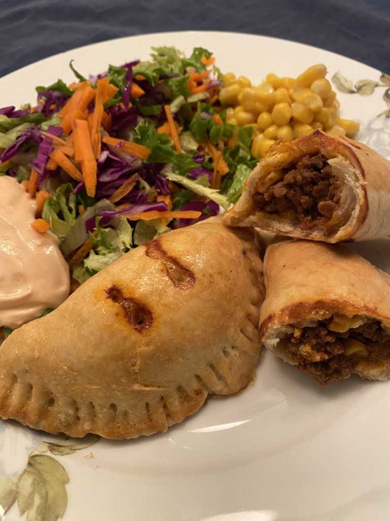 Beef empanadas are served with mixed greens and corn. (Photo by Tressa Dale/Peninsula Clarion)