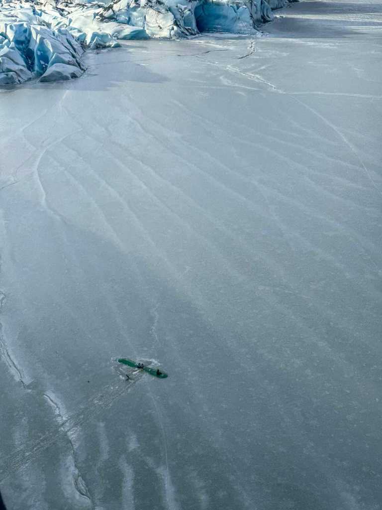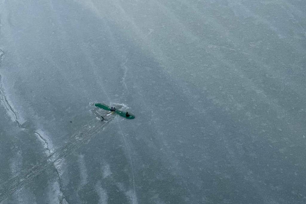 Sunday morning, one of those good Samaritan aircraft located the wreckage. In a photo shared with the Clarion, the three occupants can be seen atop the wing of their plane sitting on the ice. The body of the craft was submerged.