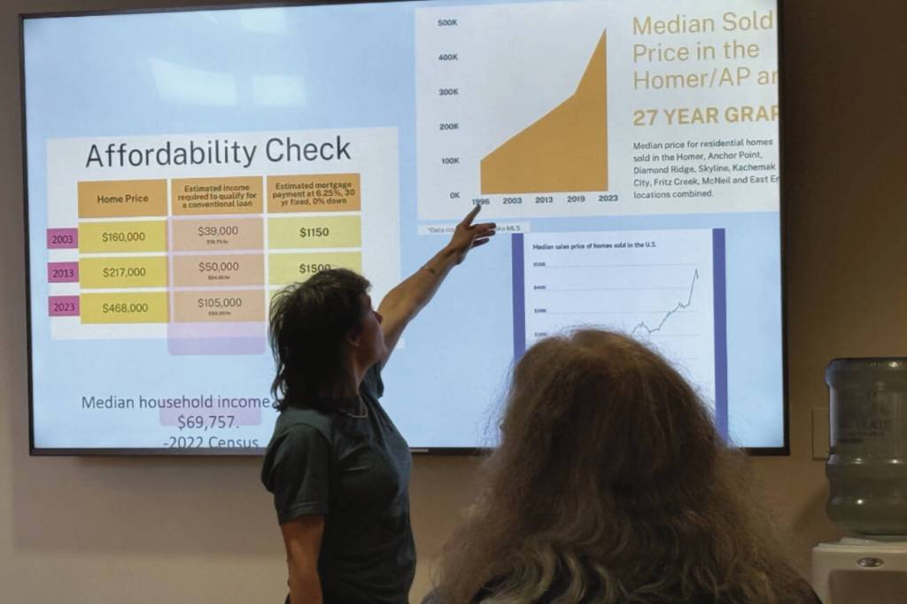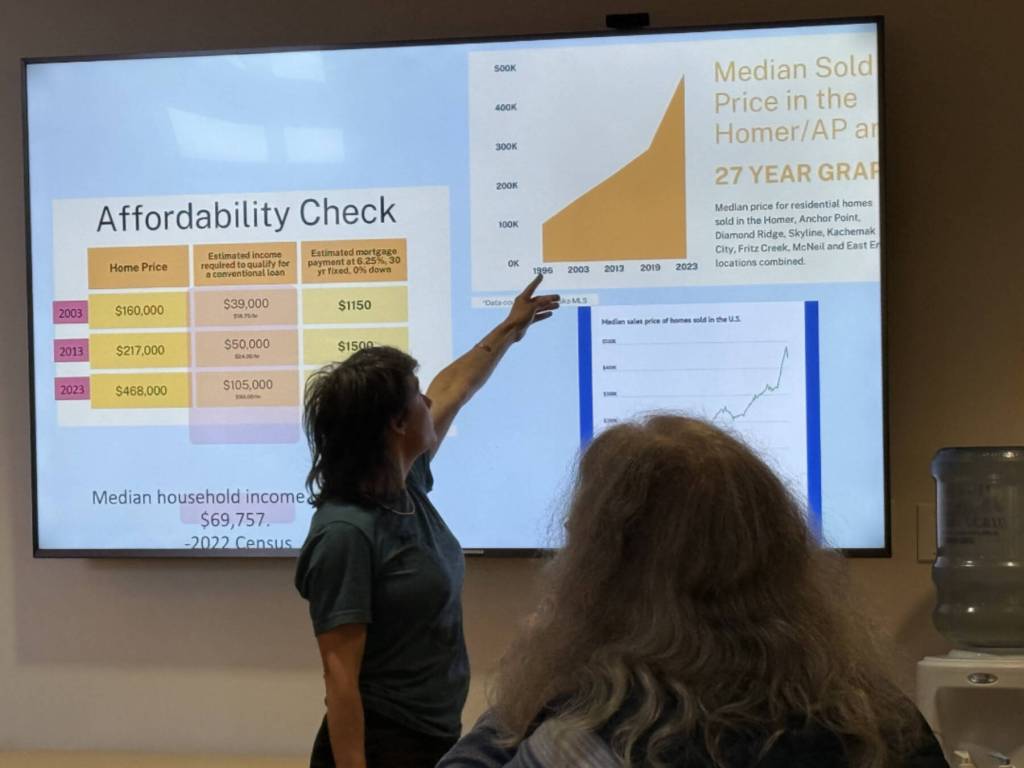Housing in Homer reflects national trends in that home prices have increased substantially over the years without reflecting income increases. On Tuesday, Penelope Haas with Kachemak Bay Conservation Society noted statistics that stated the median home price in 2003 was $160,000, with an estimated $39,000 income needed to qualify for a conventional loan. In 2023, the median home price was $468,000, and an estimated household income of $105,000 is needed to qualify. In 2003, a mortgage at an average rate, with no down payment would be $1,150 a month. In 2023, it would be more than $3,000. The median household income in Homer, based on the 2022 census, is $69,757.