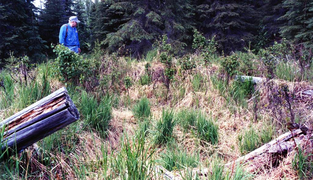 Drew O’Brien explores the ruins of the Kings County Mining Company’s cabin near Skilak Lake, circa 1999, about a century after it was constructed alongside a then-unnamed stream. (Photo by Clark Fair)