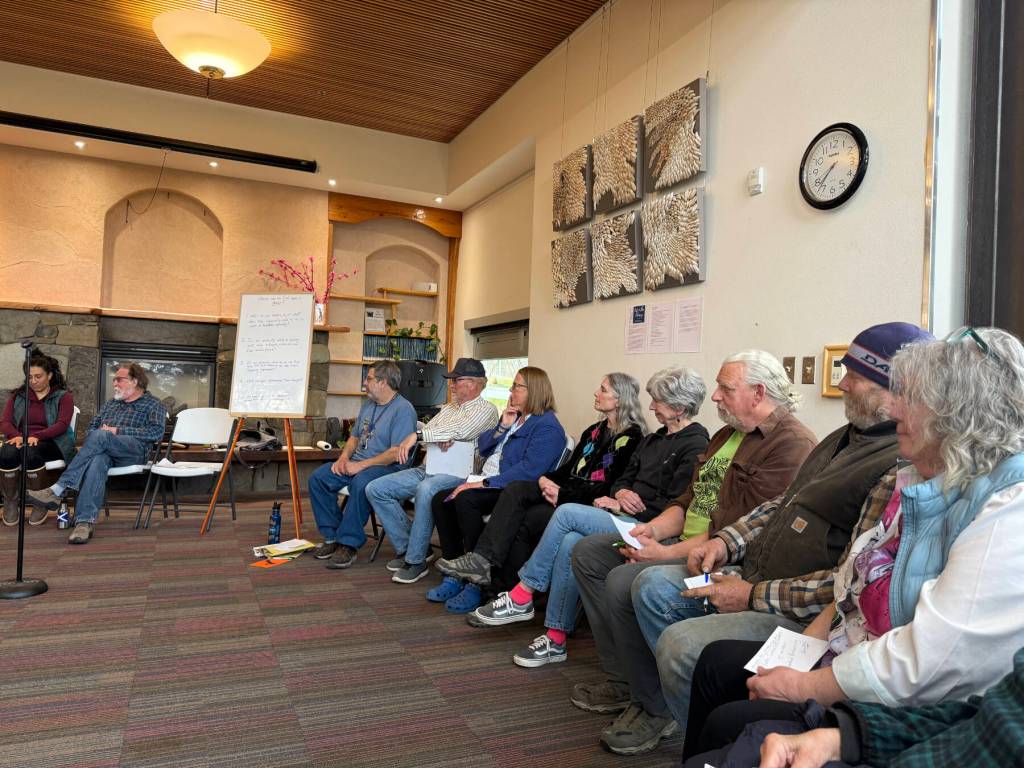 About two dozen people gathered on Tuesday, April 29, at the Homer Public Library Fireside Reading Lounge to discuss the concept of community and what it means to them.