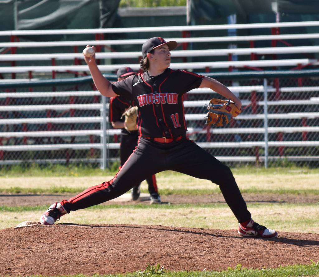 Houston’s Anthony Mazzella delivers to Soldotna at the Division II state baseball tournament Thursday, June 6, 2025, at Coral Seymour Memorial Park in Kenai, Alaska. (Photo by Jeff Helminiak/Peninsula Clarion)