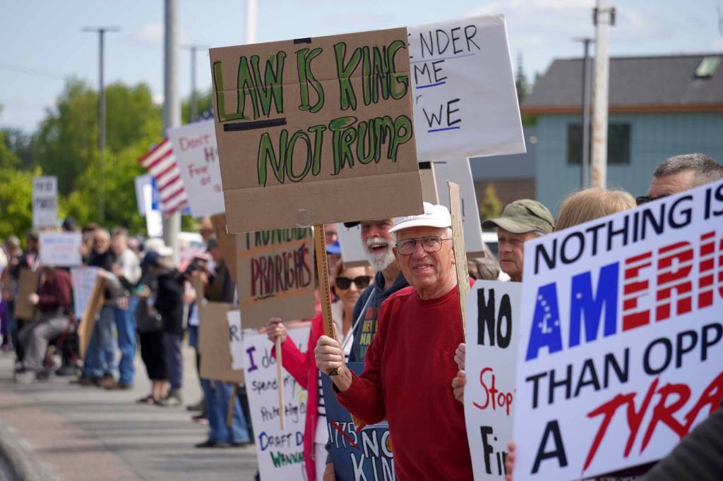 In Soldotna, protesters carried signs decrying the actions and words of U.S. President Donald Trump. Many said simply “no kings,” referring to what has been described as authoritarian overreach by Trump and his allies in slashing federal funding, cancelling programs and pushing for increased deportation of immigrants. One sign read “No kings except in the Kenai River.”