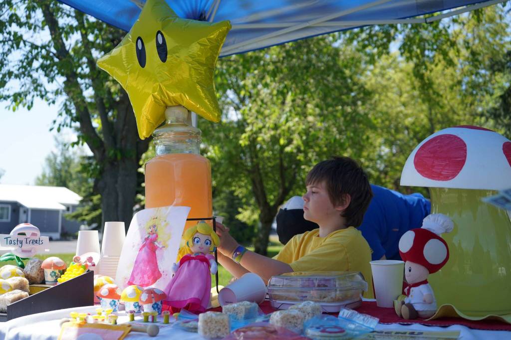 Just up the road, by the Soldotna Public Library, Robby and Isaiah Painter were running “Toad’s Lemonade,” named for the character inspired by a toadstool mushroom from Super Mario. They had a regular, yellow brew and a peach-flavored alternative in homage to Princess Peach.