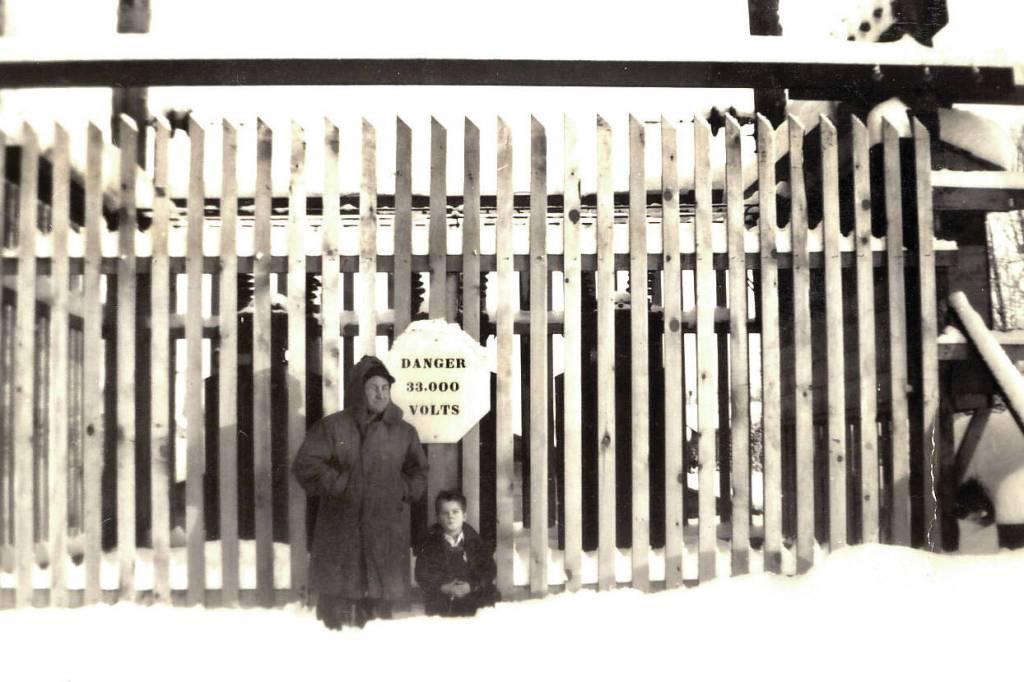 Frank Rowley and his youngest child, Raymond, stand in knee-deep snow in front of the protective fence around the main substation for Mountain View Light & Power in Anchorage in 1948 or ’49. This photo was taken a year or two before Rowley moved to Kenai to begin supplying electrical power to the central peninsula.