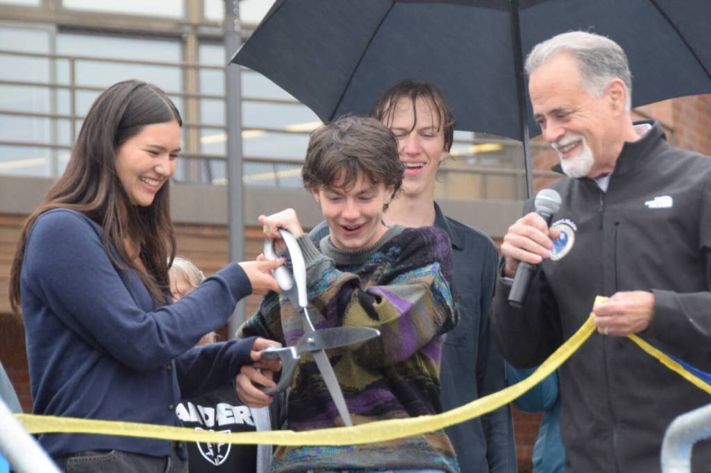 Homer High School Student Body President Marina Co and Vice President Reid Rauch cut the ribbon on Thursday, Sept. 11, 2025 while KPB Mayor Peter Micciche and Homer High School Principal Eric Pederson look on. (Chloe Pleznac/Homer News)