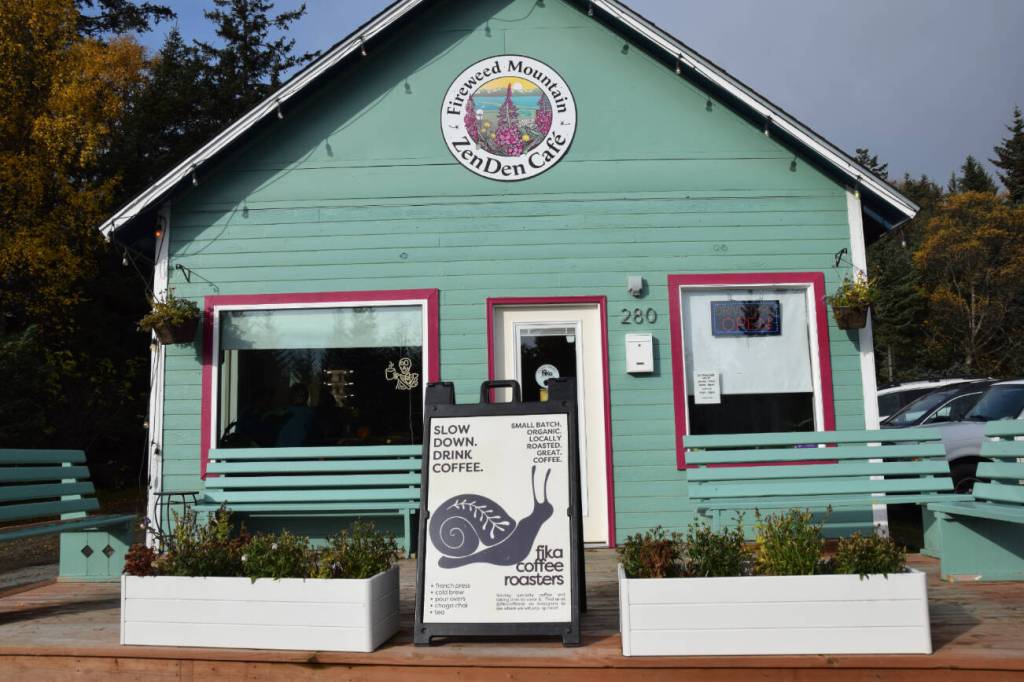 A Fika Coffee Roasters sign sits outside of ZenDen Cafe on Tuesday, Oct. 7, 2025, in Homer, Alaska. (Delcenia Cosman/Homer News)