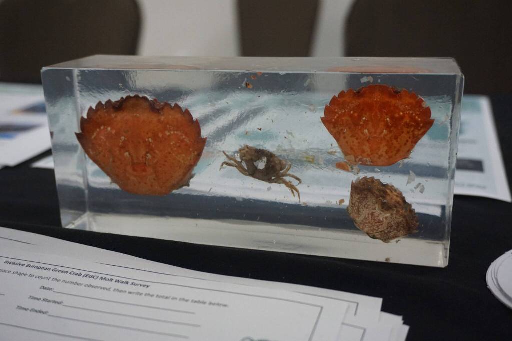 “The other day, the mayor was driving down the street and got flagged down by two little kids. And they said, ‘We found some green crab! We know its green crab because it’s 5-3-5,’” Winter said during the workshop presentation. The numbers reference the array of shell bumps on a green crab. “Those little kids absolutely knew how to identify the European green crab.”