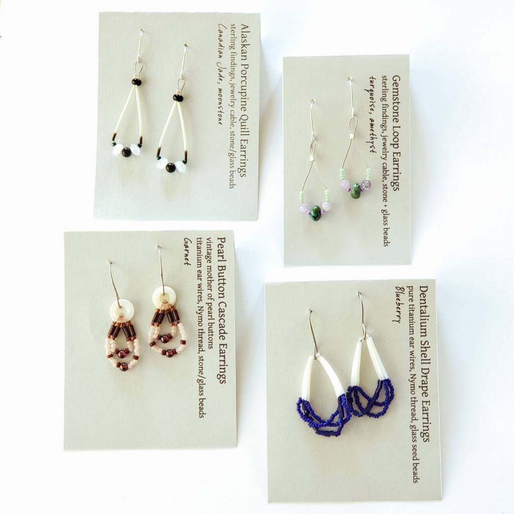 She makes several different styles of jewelry, including earrings and necklaces using materials like porcupine quills, stone and glass beads, bone and ivory. Her Midnight Sun Landscape earrings are original collage work made from torn paper. These torn paper scraps are also used in her landscape collages that come in myriad sizes, from larger, frameable pieces to smaller cards to micro-sized buttons and magnets.