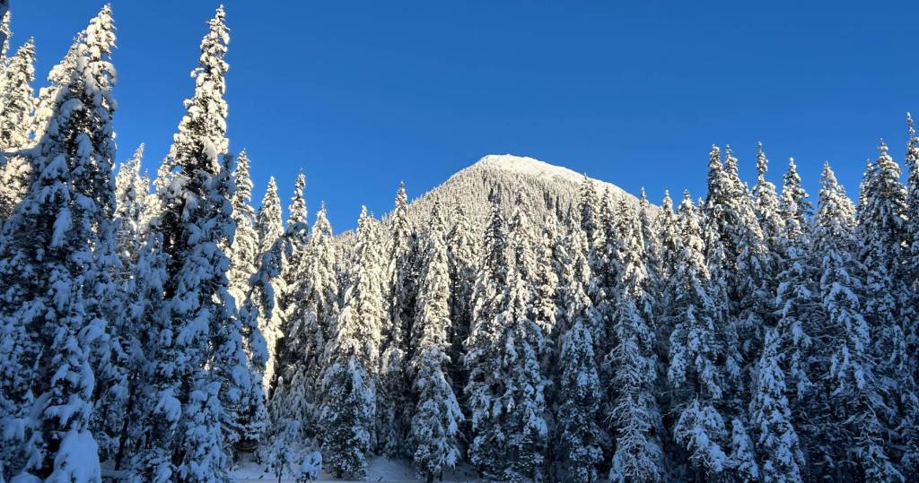 Snow-covered trees and peaks are pictured from a frozen pond near the Herbert Glacier trail in Juneau, Alaska, on Thursday, Dec. 11, 2025. (Chloe Anderson/Peninsula Clarion)