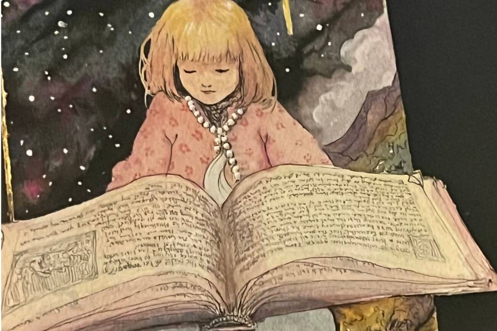 “This is a soft and whimsical piece about youth and about imagination,” Featherstone said. “As I worked on this piece, I found myself so connected to the child pictured that it became important to me to truly give the little one something to read. So I turned it upside down and wrote out the story of The Frog Prince from my collection of ‘Grimms’ Fairy Tales,’ complete with a teeny illustration of the princess by the well. Even though it is too small to read, it brings me joy knowing it’s actually there.”