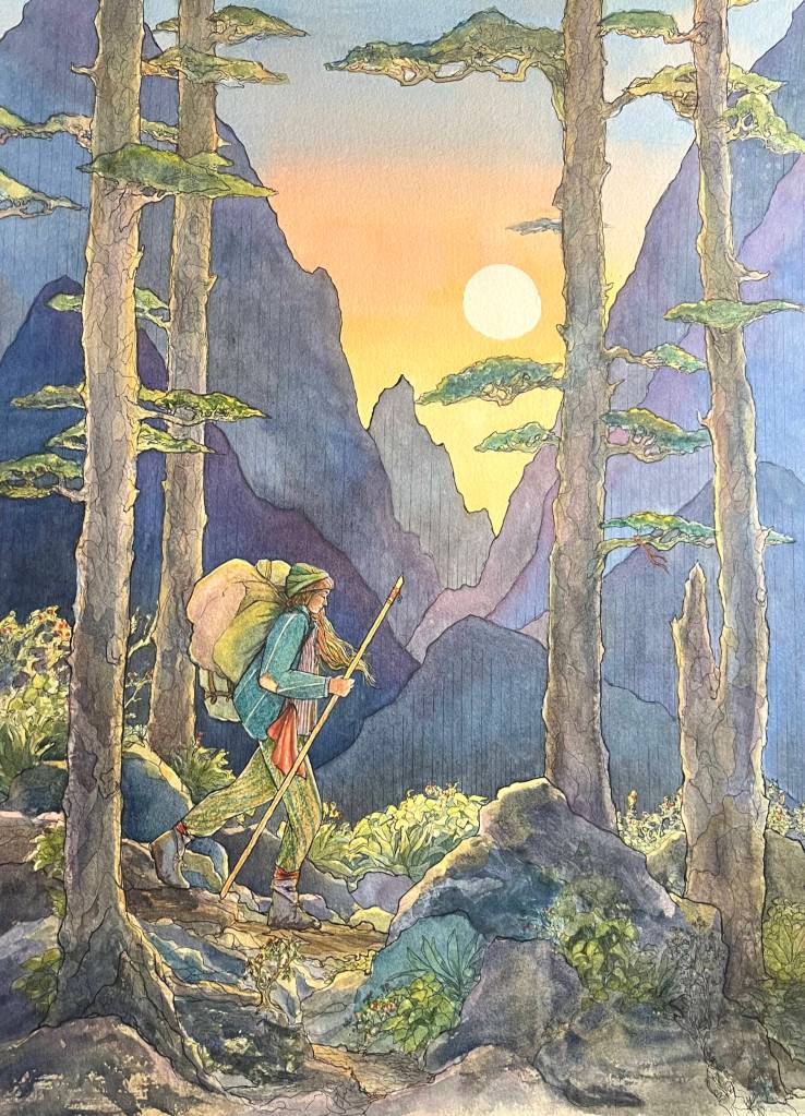 The largest watercolor and ink painting she has ever done, “The Long Road Home,” features a woman carrying a heavy load hiking down a hill. Featherstone started this piece while she was still living in Oregon.