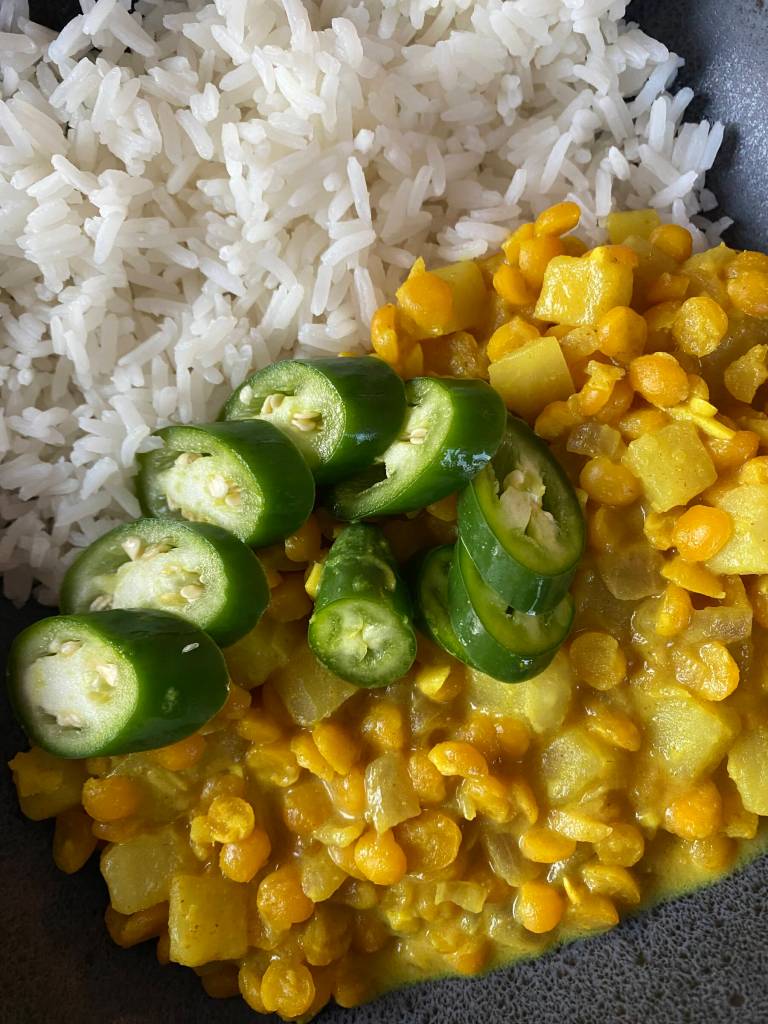 This yellow split pea curry is mild and rich with coconut milk and spices, and makes a complete meal when paired with steamed rice. Photo by Tressa Dale/Peninsula Clarion