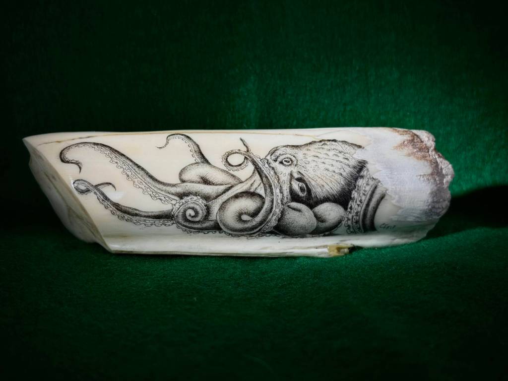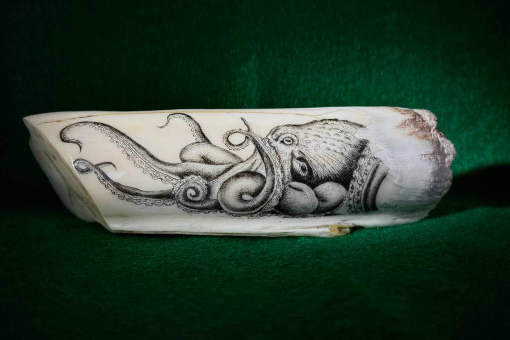 “When I got here, I saw scrimshaw work everywhere and I started playing around on different mediums, whatever I could find, including antler, bone, ivory and fossilized mammoth ivory,” he said. “I taught my first scrimshaw class while I was also lecturing about whales and whaling.”