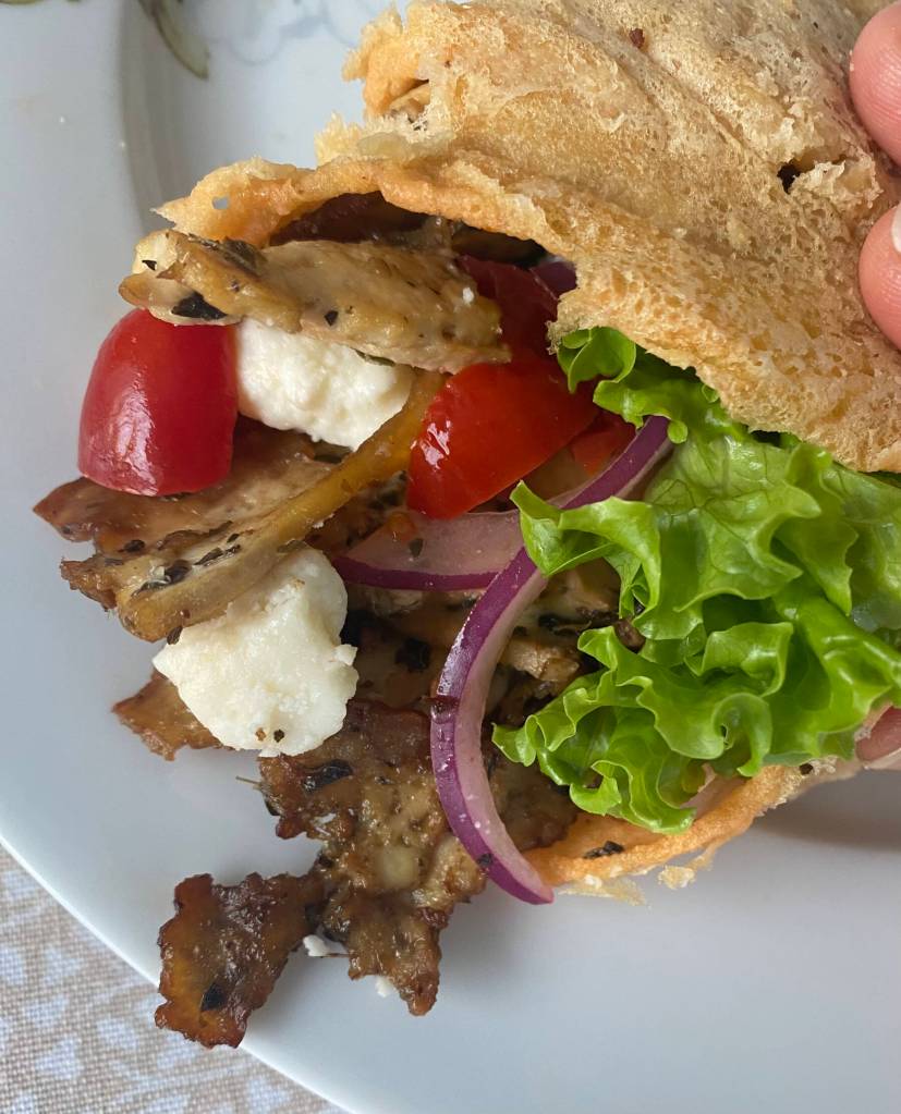 Assemble your gyro in a pita or wrap with tomato, red onion, feta cheese, lettuce, and a sauce made of yogurt and lemon juice or tzatziki if you are feeling extra motivated. It would also make an excellent addition to a Greek salad.