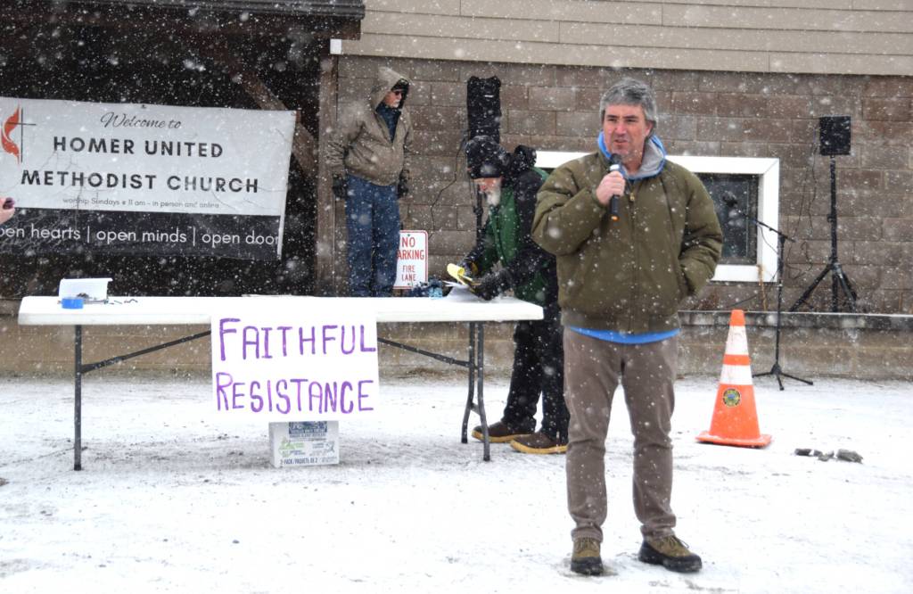 Homer United Methodist Church Rev. Blake Langston speaks to those attending a vigil for Sonia Espinoza Arriaga and her three children, who were deported from Soldotna last week, during the HUMC Civic Engagement Group’s “Faithful Resistance” event on Wednesday, Feb. 25, 2026, in Homer, Alaska. (Delcenia Cosman/Homer News)