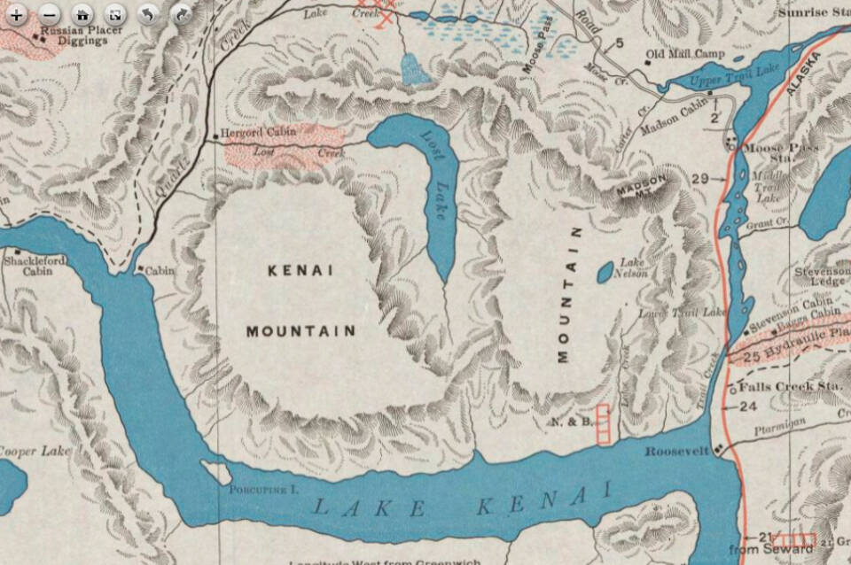 To be fair, in those roadless days of the central Kenai Peninsula more than a century ago, it would have been difficult to “ground truth” all of the trails and streams, lakes and peaks that Dr. Sleem depicted on his map. He almost certainly relied on prior maps and on information from other sources, so some imperfections are understandable.