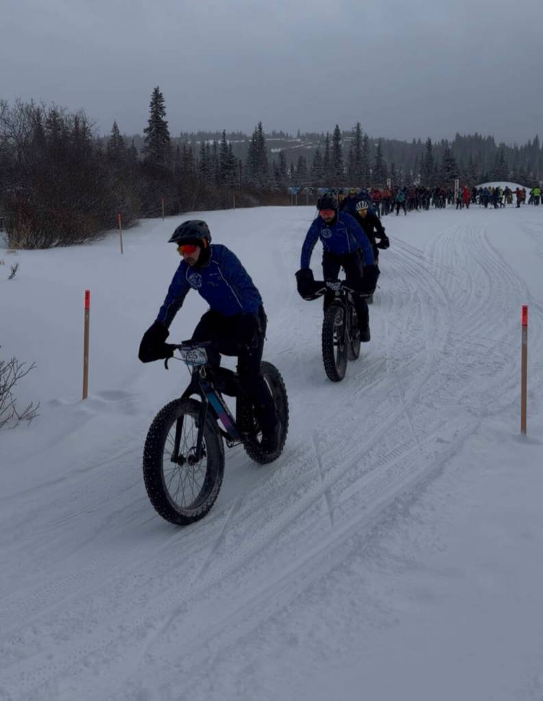 “However, the new snow and wind made conditions difficult, especially for bikers. Volunteers packed the route with snowmachines again the night before the event. Some racers experienced very windy, almost whiteout conditions on the Eagle Lake plateau.”