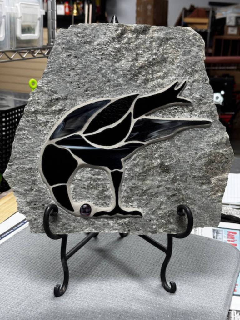 “Raven with Berry” is Miller’s mosaic on stone that depicts the bird with a red berry in its beak. Made from black and a black/white glass, she created this piece last November, inspired by the love she and her mother shared for the bird.