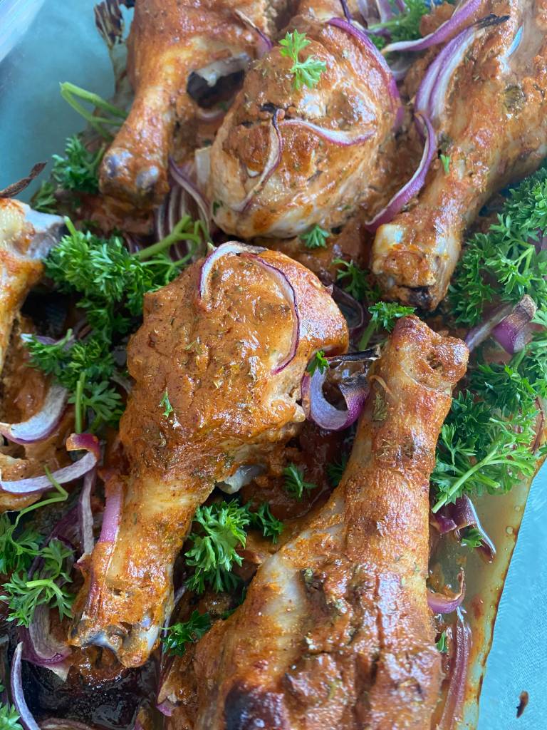 He has my heart and carries it with him wherever he goes. When he comes home weary, I bring him a plate of my devotion and tell him I hope he likes it. On his one day off this week, I made him a simple meal with depth. These baked chicken drumsticks are cooked in a tangy sauce that cuts the richness of the fat, making the dish balanced and complex, a perfect match.