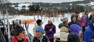 Participants in the Kachemak Nordic Ski Club Wine and Cheese Tour on Sunday, Feb. 14 gather for the raffle drawing, which included a trip for two to a yurt across the bay with transportation and two kayaks, several items from local potters and a wood turner, as well as other donations from Homer businesses. Participants were encouraged to dress in old-fashioned ski gear and old wooden skis. Many interesting outfits and a variety of wooden skis made an appearance at the event — even a large traditional homemade ski pole with a basket made from a reworked dog bone, manufactured by Dave Brann.-Photo provided
