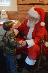Santa Claus visits with Ryder Donahue at the Harrington Cabin during the Pratt Museum Stocking Stuffer Party last Saturday. Ryder is from Eagle River and was visiting his grandparents in Homer.