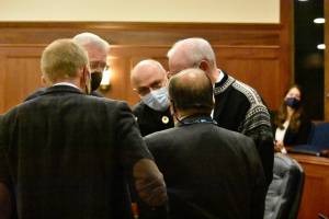Senators converse during an At Ease in a floor session of the Alaska State Senate on Tuesday, Sept. 14, 2021. Senators passed a budget bill with a Permanent Fund Dividend of $1,100, but there's disagreement over the fund sources that may lead to legal action. (Peter Segall / Juneau Empire)