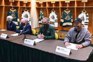 University of Alaska Anchorage Chancellor Sean Parnell, second from right, announces the reinstatement of the hockey team at a news conference Tuesday, Aug. 31, 2021, in the hockey locker room in Anchorage, Alaska. From left are Kathie Bethard, Save Seawolf Hockey chairwoman; university athletic director Greg Myford; Parnell; and former hockey player Jim Mayes. Donors, including the NHL’s newest team, raised over $3 million after the program was eliminated.
