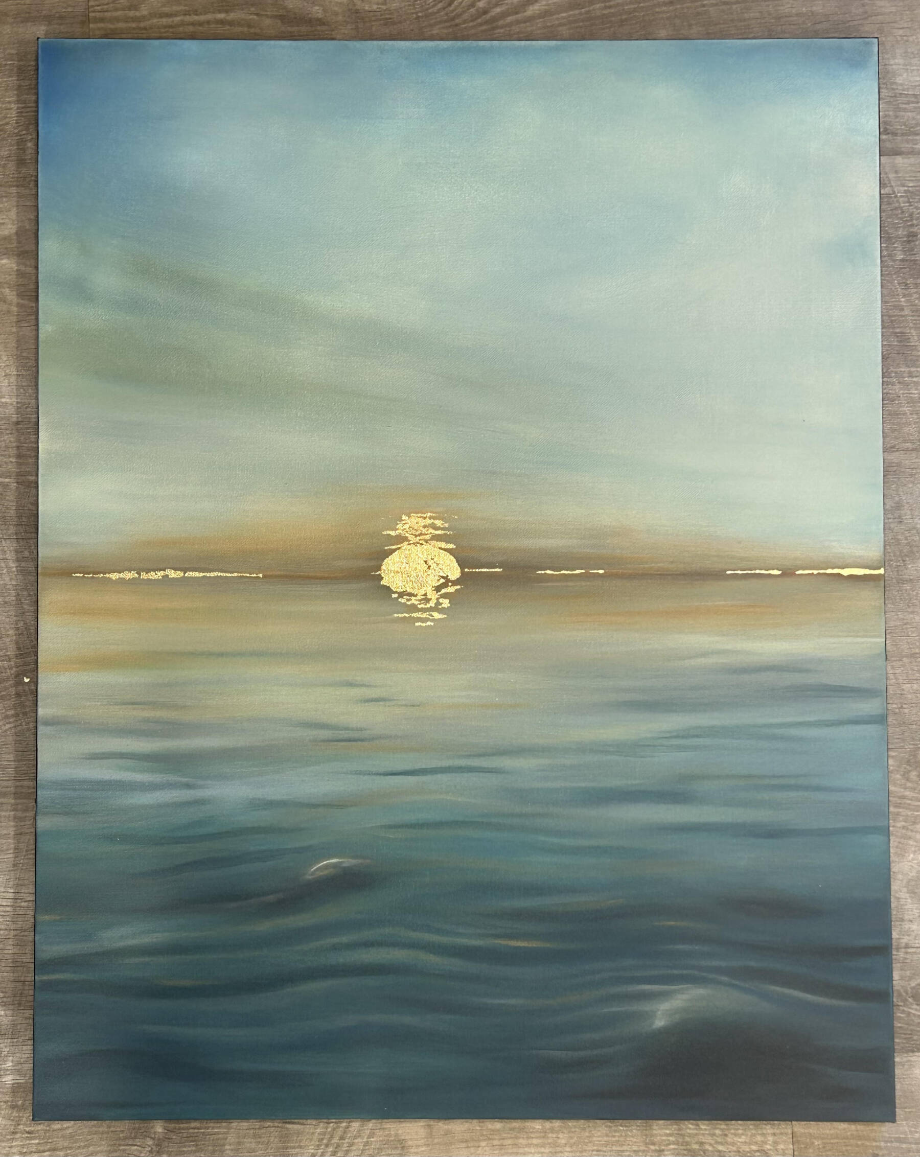 “Settle,” from the song “There is a Peace” by Harvest is an acrylic and foil painting in pale blue, green and yellow colors and a cloudy sky in the background. The moon appears to set into the ocean in the middle of the painting, and gentle waves are in the foreground. This painting was based on a photo Fraley’s daughter took of the water at Cannon Beach in Oregon last year.