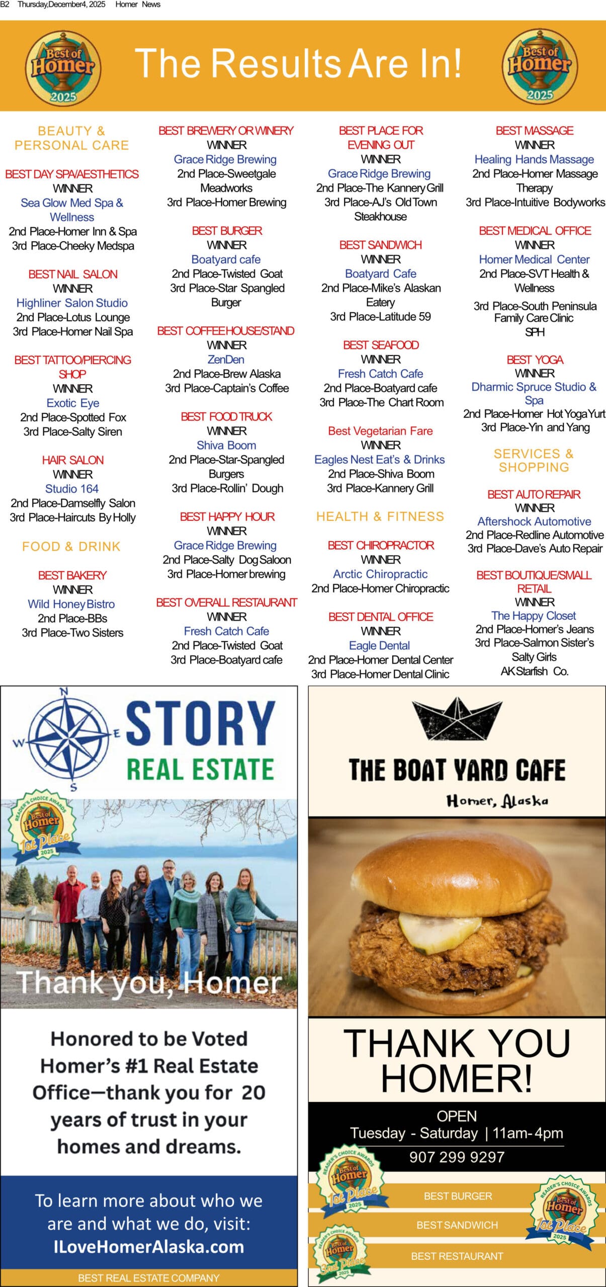 Begun in 2023, the “Best of Homer” joins this effort to support local businesses and recognize their valued contributions to the greater community. Check out the results of this third annual “Best of Homer” feature.