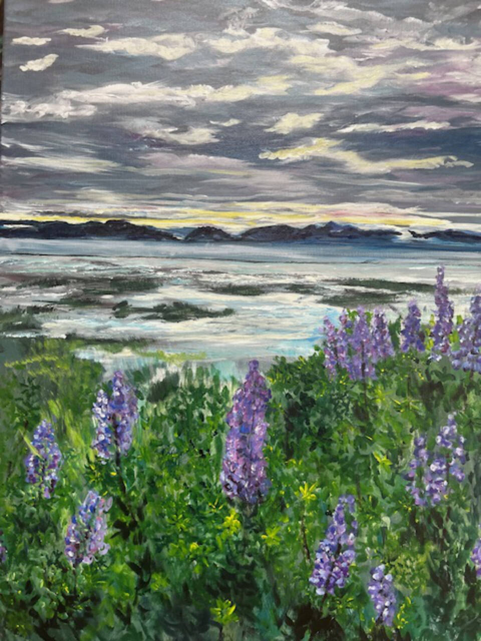 “Homestead Sunrise” is a panoramic acrylic painting of the sun coming up over Kachemak Bay with the long rays of light reflecting on the water and a small, rustic cabin nestled into the scene. The mountains are painted in varying shades of blue that accentuate the different peaks and while the colors of the bay mimic those of the mountains, yellows and oranges of the light of the sunrise blend in and blue-purple lupine flowers rise up in the foreground to meet the light.