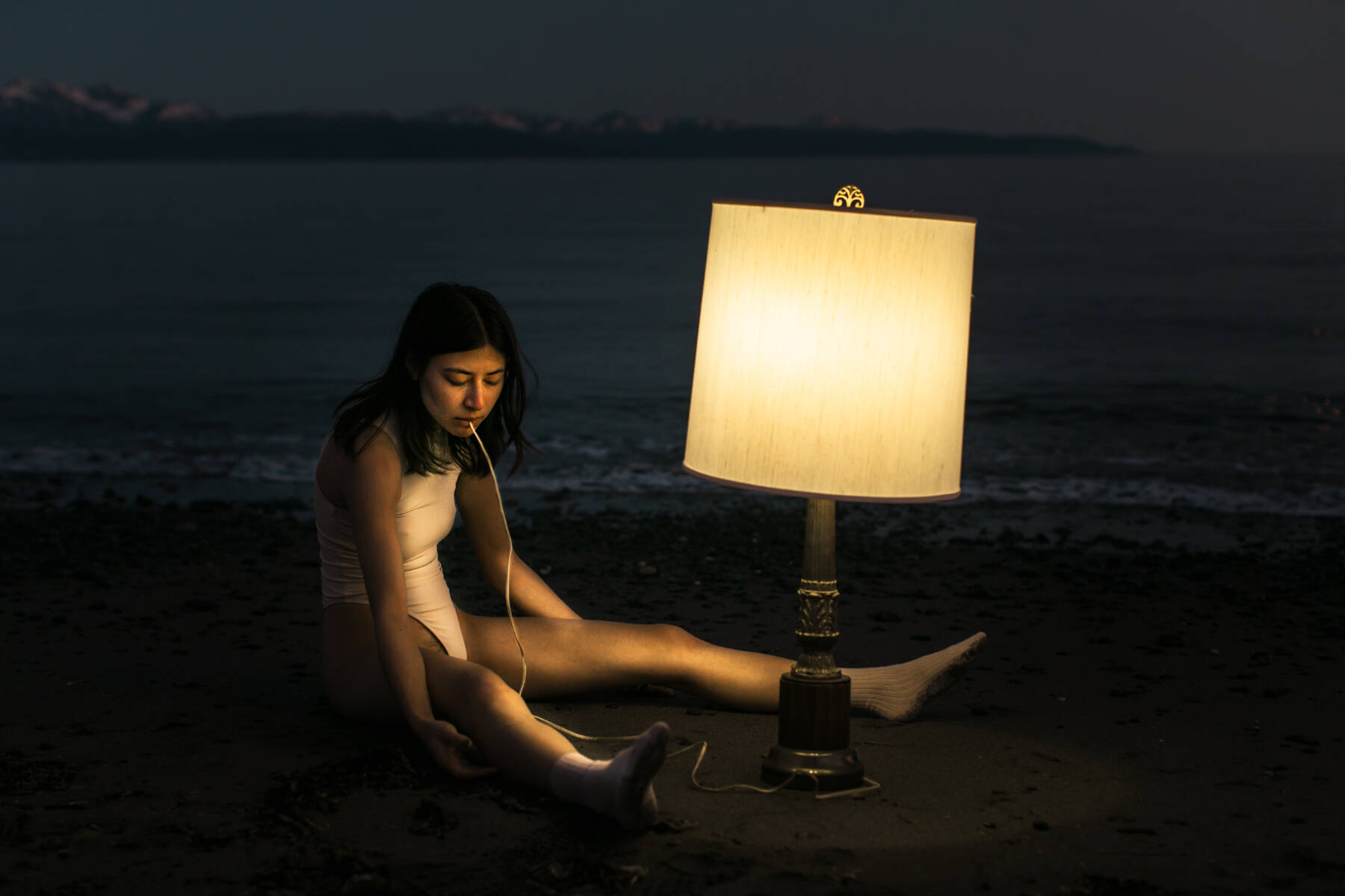 Crain’s portrait, “Autonomy Abduction,” shows a woman sitting on a shoreline at night, with the only light coming from a tall lamp in front of her whose cord runs from the lamp to her mouth. This was a shoot Crain had been wanting to put together for over a year and finally created three years ago on Bishop’s Beach with Kristen Steimer as her model.