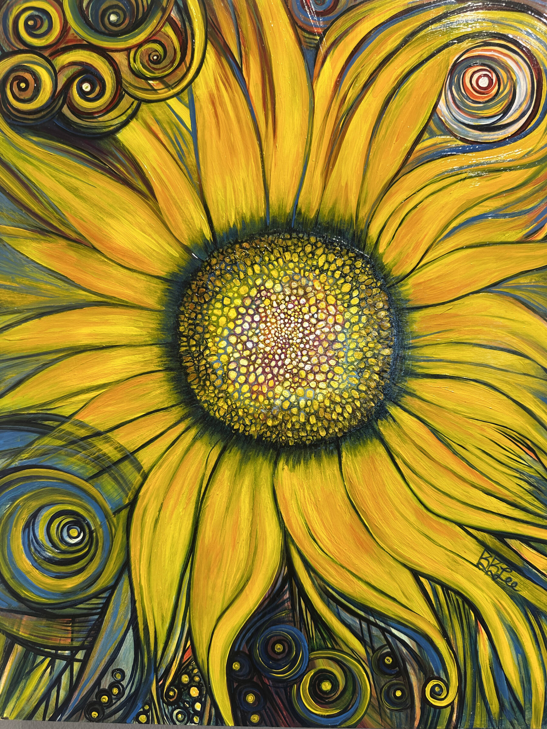 The last piece Lee created for this body of work is “Regeneration,” a mixed media piece that started with a drawing and collage and was built up with oils. Utilizing a full palette of colors, this painting features abstract swirls that at once appear to radiate from a center point while at the same time cascade inward and outward from all sides.