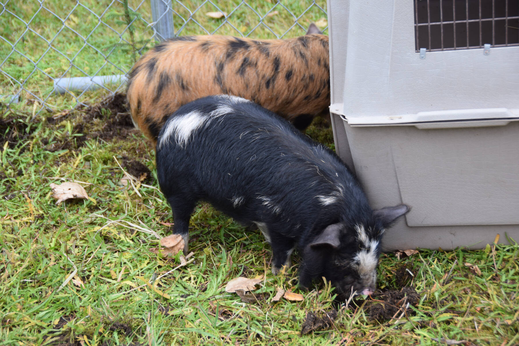 Baby pigs, part of the petting zoo provided by the Anchor River Llama Alpaca Ranch and Backyard Dreams Farm, root around in the grass during the Anchor Point Food Pantry’s “Frontier Days” fundraiser browse through silent auction items on Saturday, Oct. 4, 2025, at the VFW Post 10221 in Anchor Point, Alaska. (Delcenia Cosman/Homer News)