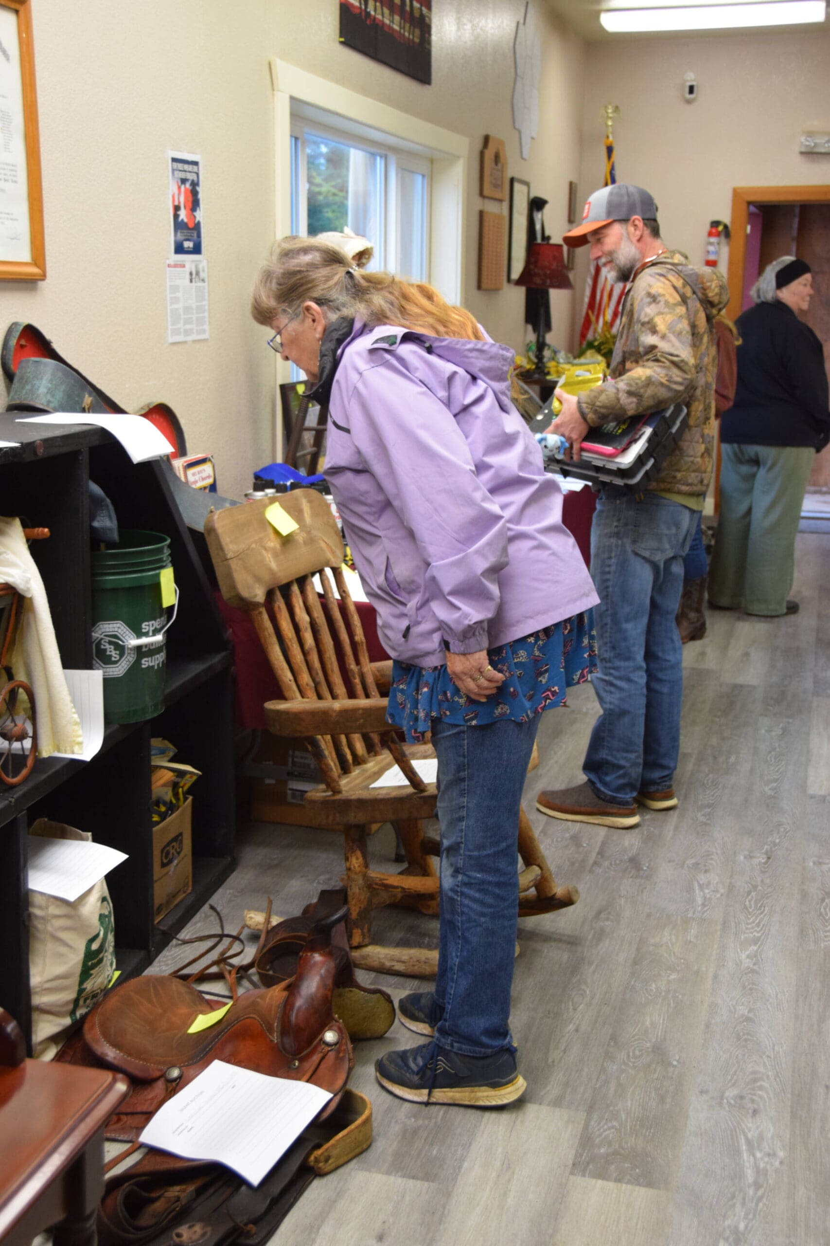 Volunteer Cathy Kremer serves as “camp cook” during the Anchor Point Food Pantry’s “Frontier Days” fundraiser browse through silent auction items on Saturday, Oct. 4, 2025, at the VFW Post 10221 in Anchor Point, Alaska. (Delcenia Cosman/Homer News)