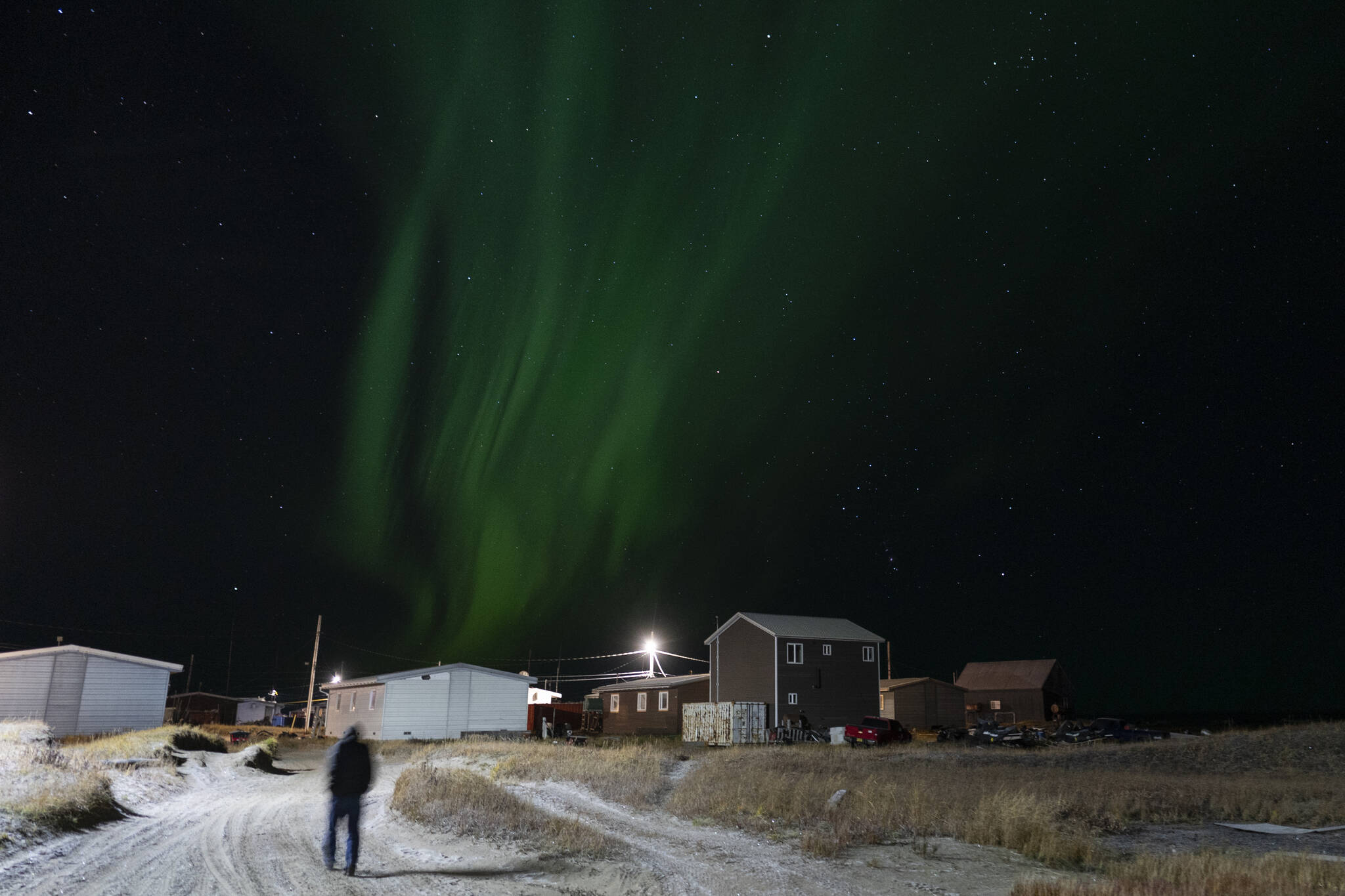 Residents drive snow machines and all-terrain vehicles that have replaced dogsleds for hunting. But there are no other vehicles on the sandy roads where children play after school and late into the evening, and where at times the night sky is lit up by spectacular streaks of green and other colors from the northern lights.