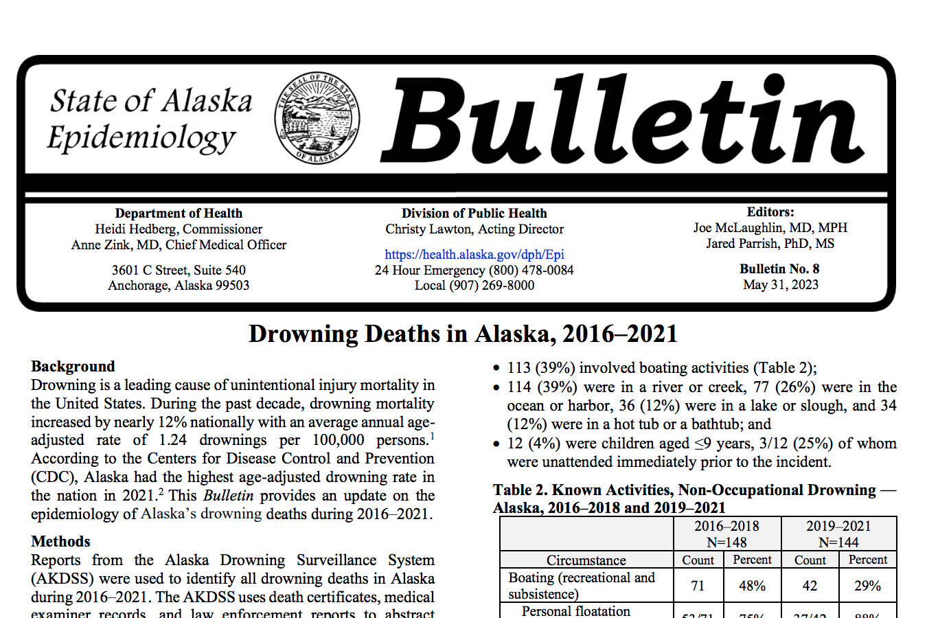The bulletin describes drowning as “a leading cause of unintentional injury mortality” in the United States. It says that nationally, the average number of drowning deaths has increased in the last decade. In Alaska, the drowning rate from 2016 to 2021 has “remained largely consistent,” but in 2021 Alaska had the highest drowning rate in the country.