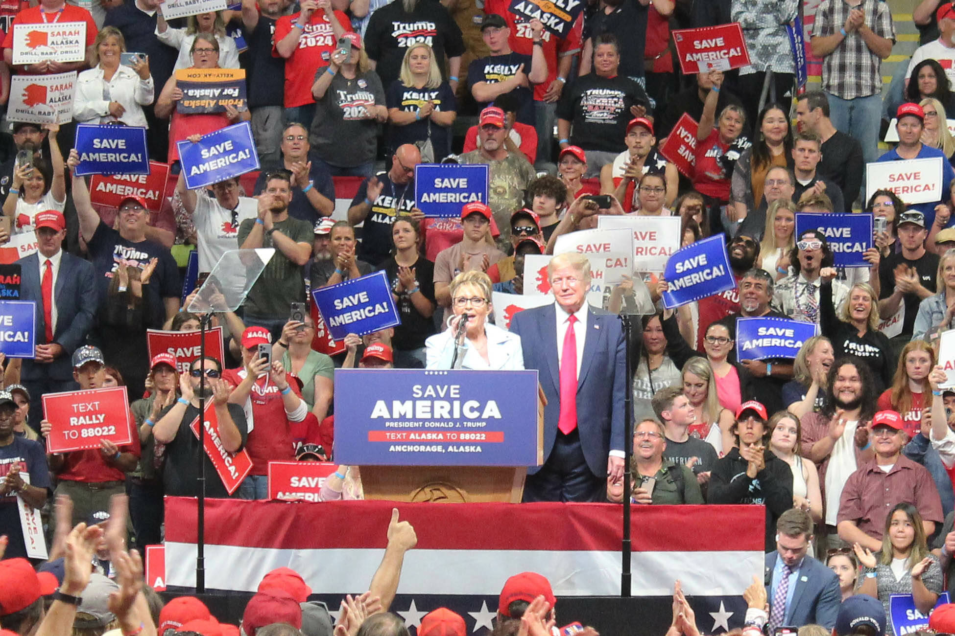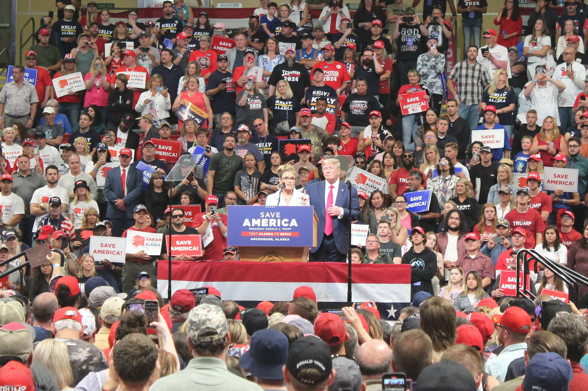 Thousands of Alaskans flocked to Anchorage on Saturday, where former U.S. President Donald Trump doubled down on his endorsements in Alaska’s two congressional races. From the Alaska Airlines Center, Trump rounded out a who’s-who lineup of Alaska conservatives that included congressional hopefuls Kelly Tshibaka and Sarah Palin, as well as Anchorage Mayor Dave Bronson and My Pillow CEO and political activist Mike Lindell.